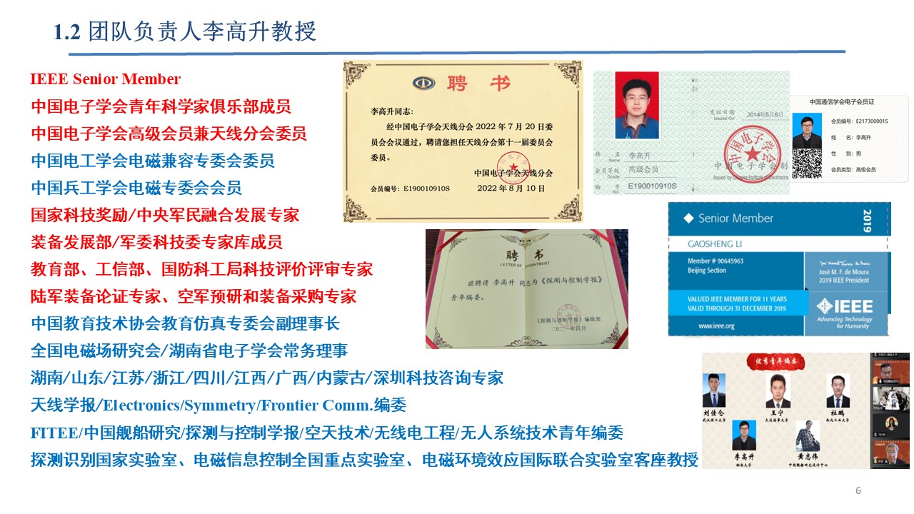 IEEE Senior Member, 中国电子学会天线分会/中国电工技术学会电磁兼容专委会委员/中国兵工学会电磁专委会委员,中国通信/造船/仪器仪表学会高级会员,中国物理/汽车/宇航/电机学会会员,ACES/ISBE/IEICE Member,博士后(南航、无锡华测),国家公派访问学者(英国利物浦大学,University of Liverpool,2016-2017;白俄罗斯国立信息与无线电大学,2010-2011),教育部电子信息专业组专家、空军装备预研和采购评审专家,国家科技奖励评审/装备发展部专业组/科技委领域主题/工信部/科技部专家库成员,湖南/山东/江苏/浙江/江西/广西/深圳等省/区/市科技咨询评审专家,中国教育技术协会教育仿真分会/全国高校电磁场教学与教材研究会/湖南省电子学会常务理事,天隼实验室/电磁信息控制与效应全国重点实验室/电磁环境效应一带一路国际联合实验室客座教授,山西省电磁防护重点实验室/中国兵器工业集团微波电磁重点实验室学术委员会委员,新疆自治区天池英才特聘专家,湖南省科技创新领军人才。