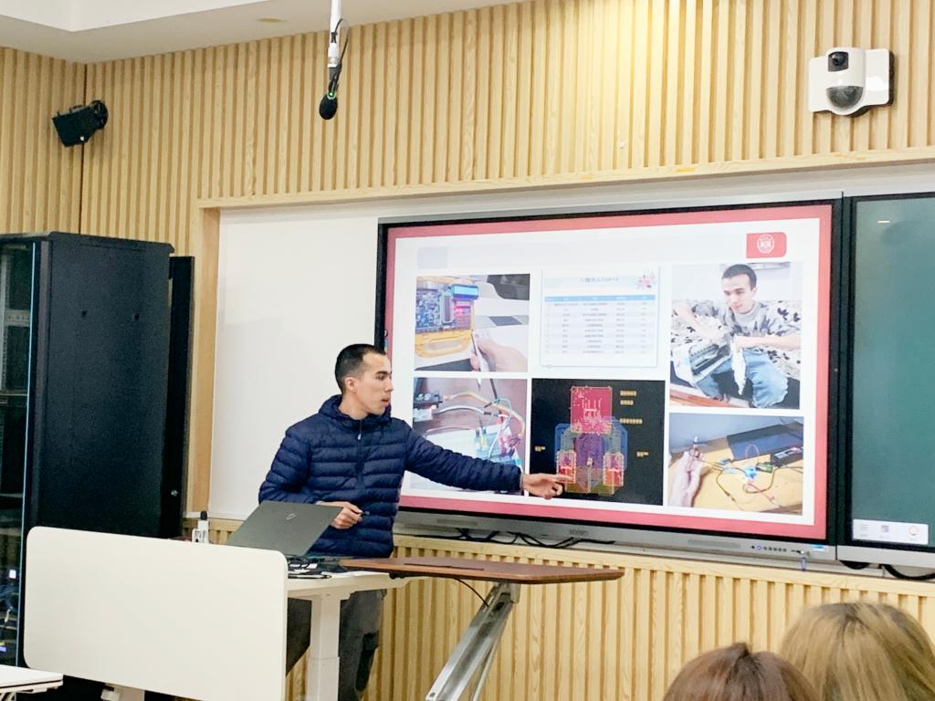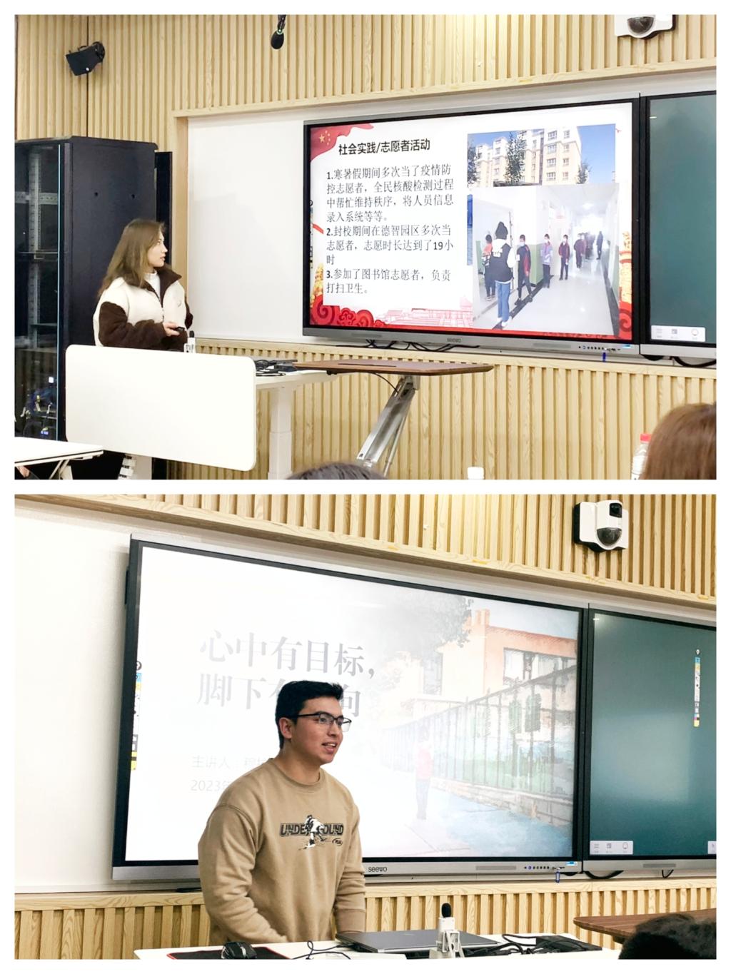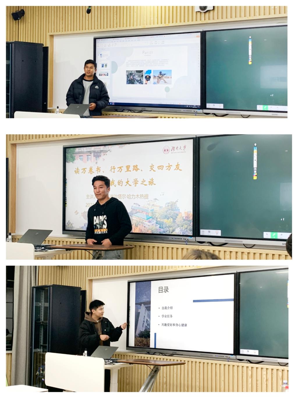 接下来,本科21级的阿布迪沙塔尔和衣明热木再木同学进行了分享。阿布迪沙塔尔同学从学习生活、课余和假期生活等方面介绍了自己学习方法、班委经历、转专业经历,志愿活动、体育赛事、兴趣爱好、健身,兼职、旅游等方面,展示了多姿多彩的大学生活。最后,将自己的三幅绘画作品分别送给了田慧老师、陈书记和金晶老师。衣明热木再木同学从自己的参军入伍经历出发,分享了入伍的原因,以及入伍后为人处世、身体素质、自制力方面的提升,并祝愿同学们都能找到自己热爱的事业并为之奋斗。最后,22级伊力亚尔同学分享了自己的学习方法和兴趣爱好,以及二者的平衡方法,鼓励同学们珍惜每一次机会,脚踏实地,充实过好每一天。