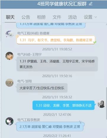 硕士2018级电气工程四班班长邹翔说道,每日和同学们嘘寒问暖,火花都养了好几个。面对疫情,各班级党员同学、支委走在前面,成立“疫情防控临时小组”,党支书、班长带头,支委班委协同并进,时刻关心班级同学身体状况,每日更新班级台账,做到事事上心、事事关心。