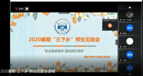 电气院“三下乡”支教团开展了集合以来的第一次线上见面会。会议由副队长郑昊同学主持,学生家长受邀出席会议,指导老师文珷强调了这是湖大电气院坚持前往岩脚侗寨的第五个年头,对家长及孩子们能参加此次“三下乡”活动表示热烈欢迎,并祝愿大家相处愉快希望大家相互深入了解、孩子们能取得进步。