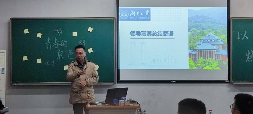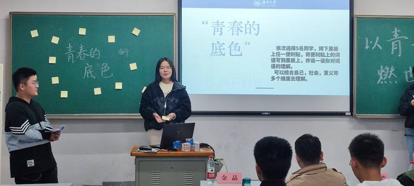 接下来,主持人带领同学们玩了一个小游戏:黑板上贴有带着青春关键词的便利贴,被抽到的同学要上去撕下其中一张,并谈谈对这个关键词的理解与感想。佘阳晨、王萌、刘译炜、刘易舟与吴逸飞同学分别对奋斗、理想、奉献、突破与担当这五个关键词提出了自己的观点。每个人的感想,都将个人与国家结合在一起。同学们知道,一滴水融入江河才能奔流,青春为国家付出才有意义。