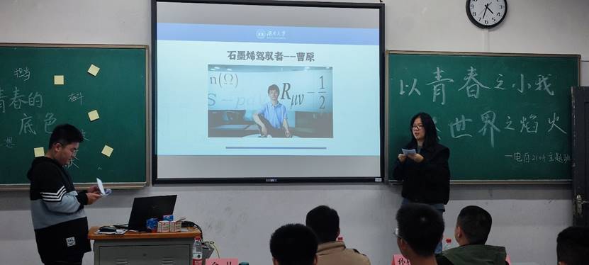 班会正式开始,主持人邵琪与主持人张俪丹首先介绍了青春的意义,同时也向同学们介绍了革命前辈们的青春故事,告诉同学们,我们现在的美好生活是革命前辈们用青春乃至生命换来的。接着,主持人带领同学们观看了《觉醒年代》的相关混剪。观看完毕,谭啸同学与龚劲轩同学谈起了自己对青春的感想。其中谭啸同学的一句话让同学们印象深刻:“世如焚炉,人似柴薪。或许我们的青春只能燃出一丝丝火光,但所有人的青春加起来,就能照亮前方的黑暗”