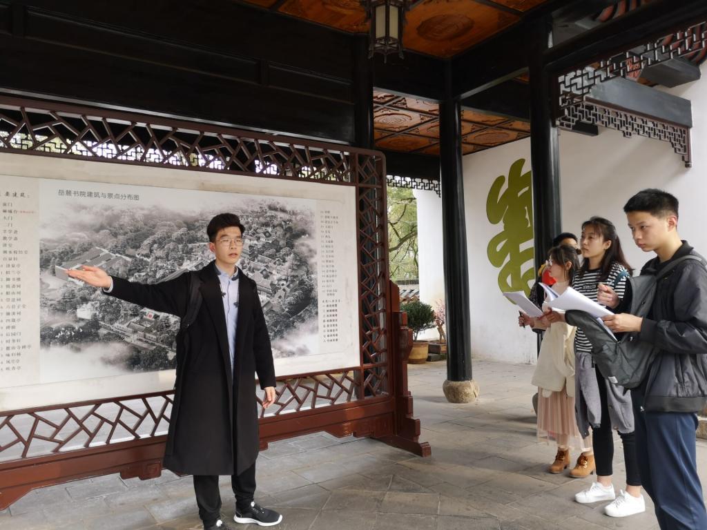 离开最后一个景点后,队员们来到了岳麓书院门口,抗战历史讲解员与岳麓书院义务导游完成了交接。书院义务导游继续了对自训队队员关于岳麓书院讲解的培训,从门口的石碑,著名的赫曦台一直到书院大门,讲堂;小到对联题字,大到御书楼文庙,早已做好精心准备的义务导游一一向队员做了详细讲解。为了营造良好的氛围,为自训队队员们做好榜样,书院义务导游认真背诵讲解词后脱稿为队员们讲解。讲解结束后,队员们仍然对岳麓书院的历史充满兴趣,待义务导游走后,大家在书院里游览几圈后才带着满是笔记的讲解词陆续离开岳麓书院。