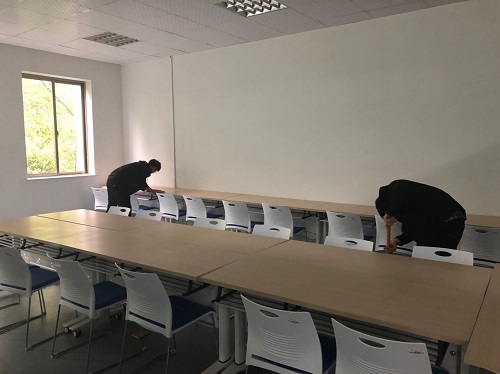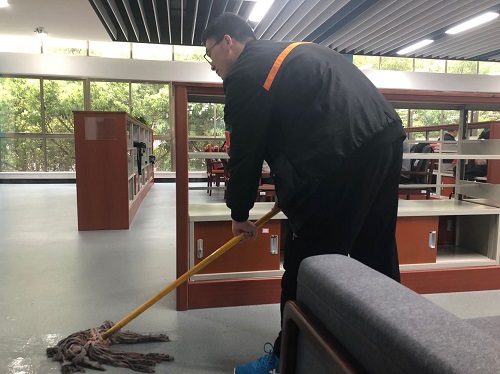德智图书馆门口集合。经生活委员王远澎清点人数之后,同学们有序地进入图书馆进行志愿者活动。同学们分为两组,由生活委员王远澎和团支书李志伟各带领一组分别前往三、四楼。与各层的楼层负责人进行交流后,同学们开始了打扫。