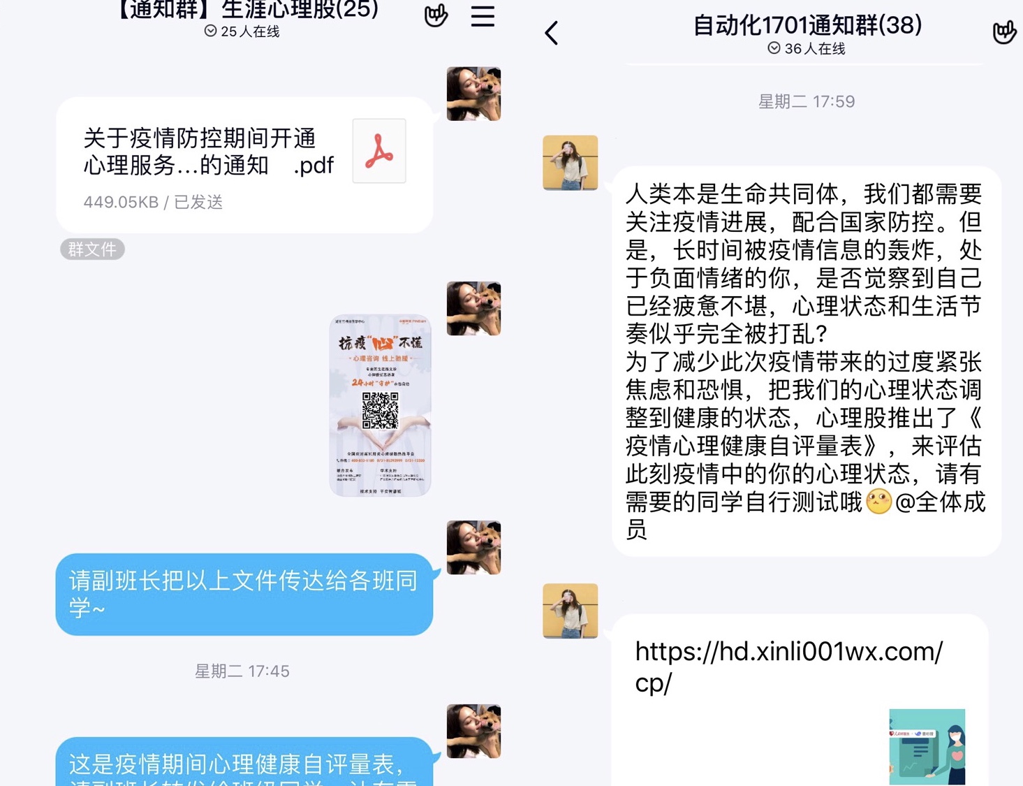 年级会生涯心理股股长潘越及时传递各类国家级、省级的疫情防控期间心理服务的相关文件,并落实到各心理委员及班级同学;鼓励心理委员培训参加线上讲座;向同学们下发《疫情期间心理健康自评量表》,为有需要的同学提供帮助;各班心理委员负责观察班级同学每日心理健康状况并上报。