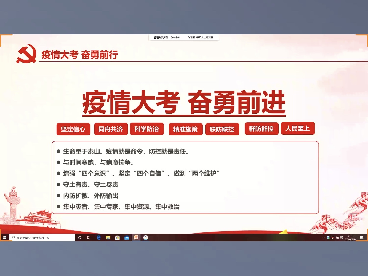 会议进行第二项,副班长李琛恭同学作为向班级同学介绍当前疫情发展的情况。李琛恭报名参与了社区防控志愿工作,他强调虽然现在全国多地已经多日无新增病例,但仍不能松懈,当前的防控重点是“严防输入病例”。接着,他带领班级同学学习了关于疫情期间心理健康的相关知识,用简单的团体辅导方式增进了班级同学的交流,让同学们面对疫情不必恐慌,只需做到“科学抗疫”。