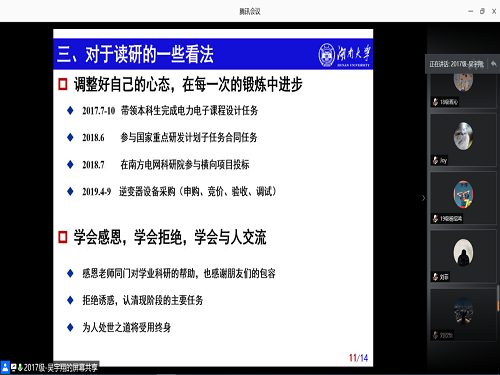 吴师兄先在湖大求学7年,即将入职湖南省电力有限公司。他以科研和竞赛经历为主题,讲述了自己参加研究生电子设计大赛过程中感悟和收货。并以此为切入点,分享了自己对研究生生活的一些感悟,不仅要专注于科研,多参与学术会议,多与学科大牛交流,还要劳逸结合积极进行文体活动。他最后特别提出在研究生生涯中要学会取舍,要明确自己的目标进行合理规划,对自己的时间和精力合理划分。有舍才有得,坚定内心,一往无前。
