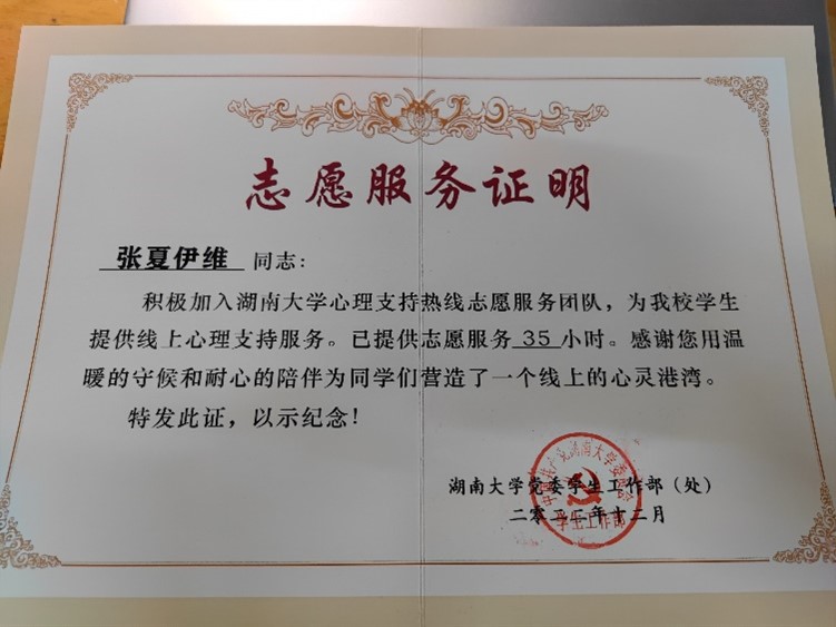 心理健康教育中心的志愿服务,累计志愿服务时长已达到70小时。在志愿服务过程中,她帮助学生化解学习和生活中遇到的困难,给予他们温暖和关爱,传递了正能量。张夏伊维同学以实际行动践行着“奉献、友爱、互助、进步”的志愿服务精神,为树立良好的社会风尚做出了积极贡献。