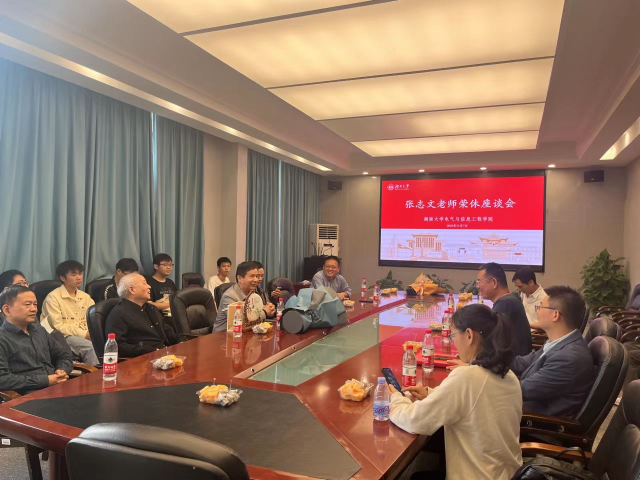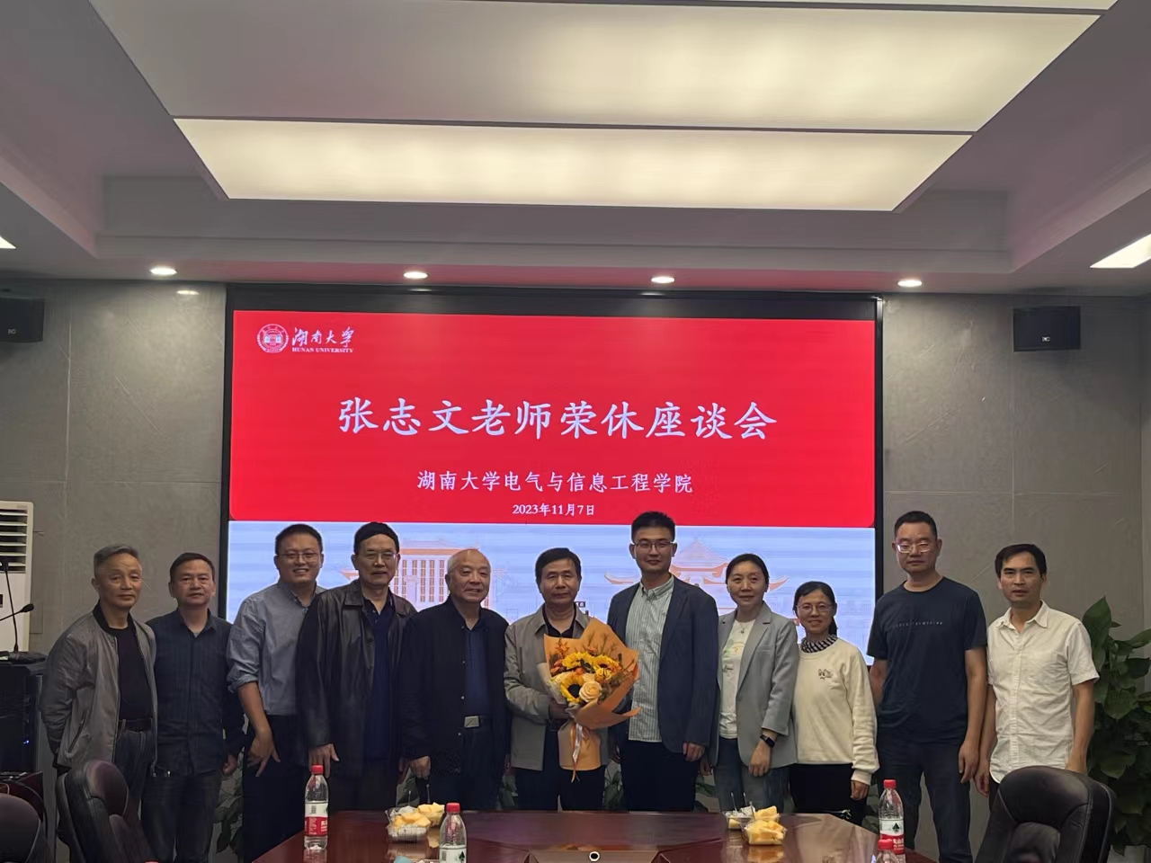 于院楼219会议室举办荣休座谈会,为荣退老教师张志文献上学院最真挚的感谢和祝福。本次活动由电自2204班协办,学院领导和电气工程系部分师生参会。