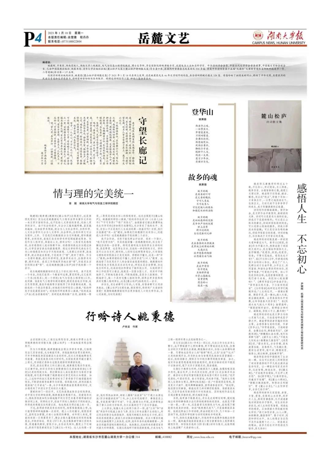 2017年姚教授退休后,将他过去四十多年点滴积累的诗词随笔整理归纳,出版了《麓山松庐文集》、《麓山松庐诗词散文集》两本文学专著,展示了一位电气学者的人文情怀。姚教授身为人师,时刻不忘为学生传道、授业、解惑,和学生交流互动,甚至和学生互诗,为学生的成长、成才传播正能量。