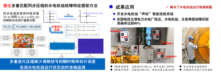水电机组运行过程中,不同部件之间互相影响,水力、机械、电气因素相互耦合,使得水电机组运行过程呈现高度非线性、非平稳和时变等特性,难以对其精确建模。同时,由于水轮机运行工况复杂,水头变化幅度较大,故障的诱因涉及多种不确定因素,导致目前人们仍未完全了解水电机组故障产生机理,无法精确刻画故障演化过程。针对水电机组运行状态监测与分析的迫切需求,我们设计宽频弱幅值声音信号滤波与调理电路,建立多路分布式高分辨率声音采集方案,提出多重匹配同步压缩的水电机组故障特征提取方法,建立基于机器学习的实时声纹与振动识别、故障预警方法,研发的水电机组声音与振动智能巡检系统在国电投五凌电力多个水电机组部署。