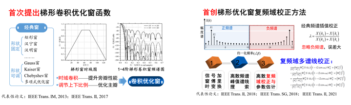 电力电子设备复杂瞬态过程产生的扰动使电网信号发生严重畸变。快速傅里叶变换(FFT)效率高但存在固有的频谱泄漏和栅栏效应,导致参数估计误差大,无法满足电网针对性监测和精准治理需求。我们以抑制畸变频谱泄漏为突破点:①建立了高性能窗函数设计新方法,提出梯形卷积优化窗,提出了适合加性稳态畸变信号的三谱线插值FFT频率和幅值估计算法,该方法在49.5-50.5Hz波动下的频率估计偏差比IEEE Fellow、仪器测量学会副主席Dario Petri提出的双谱线插值算法减少约1个数量级;②构建了信号复频谱叠加干扰模型,提出了面向振荡衰减信号的复频域插值算法,该方法在0-100dB白噪声影响下的振荡频率估计均方根误差比IEEE Fellow、国际神经网络学会主席Danilo P. Mandic提出的智能傅里叶变换提升约10dB,攻克了强噪声影响下畸变电网信号频谱精准辨识与动态频率测量难题。IEEE Fellow、美国工程院院士YiLu Liu教授评价我们的三谱线插值FFT算法“improve the frequency measurement accuracy”。IEEE Fellow、原澳大利亚能源研究所所长V. G. Agelidis教授评价我们的方法“useful under noisy conditions”。