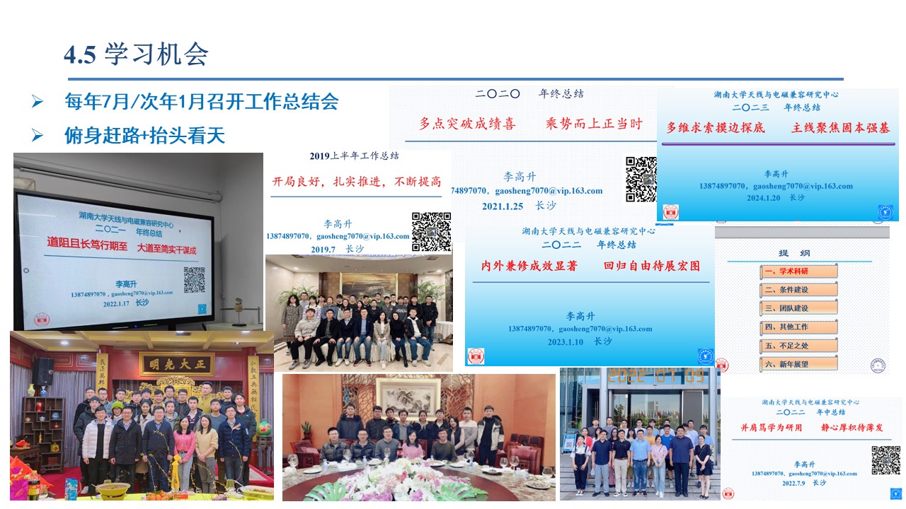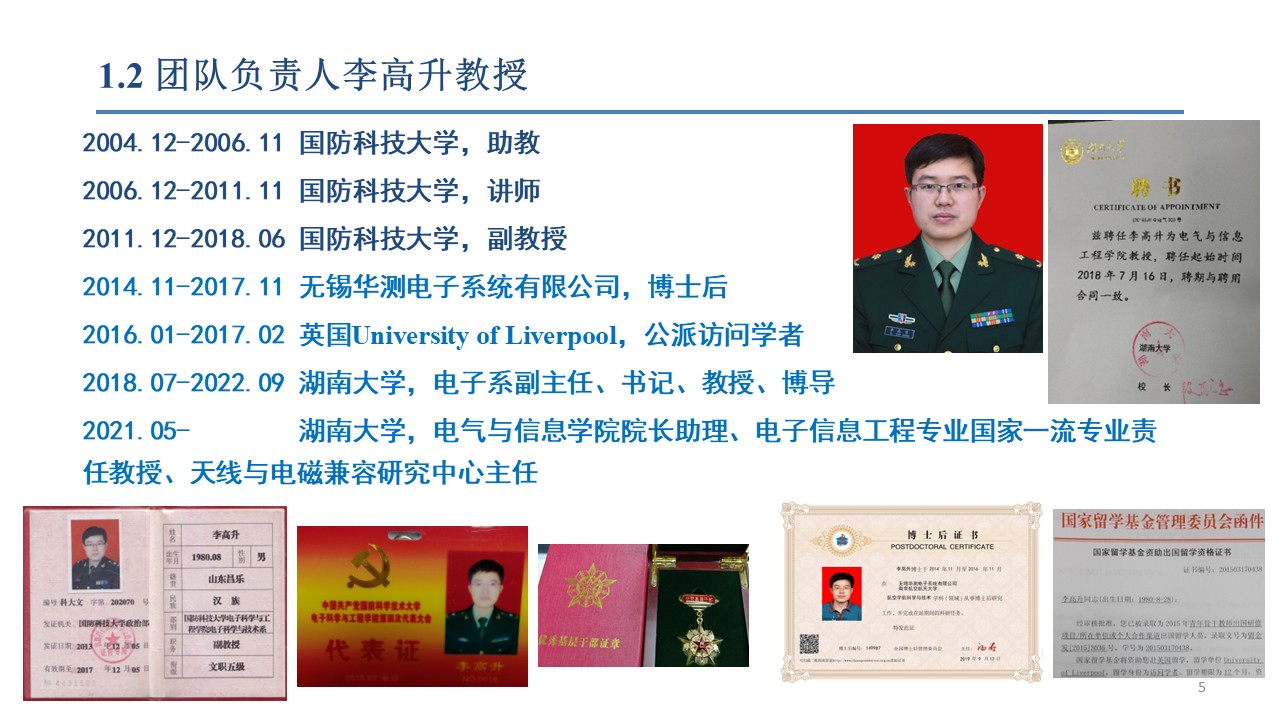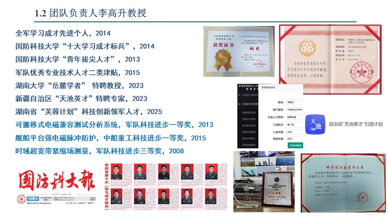 IEEE Senior Member, 中国电子学会天线分会/中国电工技术学会电磁兼容专委会委员/中国兵工学会电磁专委会委员,中国通信/造船/仪器仪表学会高级会员,中国物理/汽车/宇航/电机学会会员,ACES/ISBE/IEICE Member,博士后(南航、无锡华测),国家公派访问学者(英国利物浦大学,University of Liverpool,2016-2017;白俄罗斯国立信息与无线电大学,2010-2011),教育部电子信息专业组专家、空军装备预研和采购评审专家,国家科技奖励评审/装备发展部专业组/科技委领域主题/工信部/科技部专家库成员,湖南/山东/江苏/浙江/江西/广西/深圳等省/区/市科技咨询评审专家,中国教育技术协会教育仿真分会/全国高校电磁场教学与教材研究会/湖南省电子学会常务理事,天隼实验室/电磁信息控制与效应全国重点实验室/电磁环境效应一带一路国际联合实验室客座教授,山西省电磁防护重点实验室/中国兵器工业集团微波电磁重点实验室学术委员会委员,新疆自治区天池英才特聘专家,湖南省科技创新领军人才。