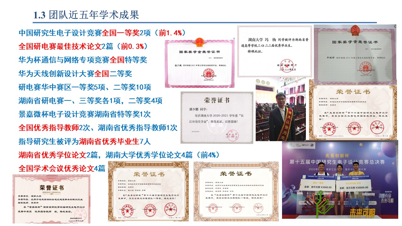 作为指导教师获得研究生电子设计竞赛全国一等奖(前1.4%)2项、二/三等奖各1项,全国研电赛最佳技术论文(前0.3%)2篇,华为通信与网络竞赛全国特等奖1项、天线创新赛全国二等奖1项、射频挑战赛全国三等奖2项,景嘉微杯电子设计竞赛全省特等奖1次,研电赛华中赛区一等奖7项、二等奖10多项,湖南省研电赛一/三等奖各1项、二等奖4项,全国学术会议优秀论文奖4项,湖南省电子学会优秀论文一等奖1项,互联网+/博士后/北斗应用/麓山杯/i创杯等创新创业大赛省部级奖励10多项,被评为全国优秀指导教师2次、湖南省优秀指导教师1次,里番动漫