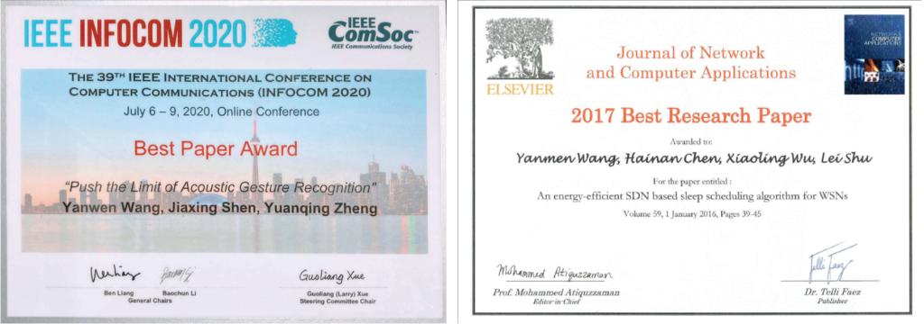 [13] [Elsevier JNCA] Yanwen Wang, Hainan Chen, Xiaoling Wu, Lei Shu, "An Energy-efficient SDN based Sleep Scheduling Algorithm for WSNs," Journal of Network and Computer Applications, Volume 59, 2016, Pages 39-45. [Best Paper Award JNCA 2017] (SCI, 中科院二区TOP).